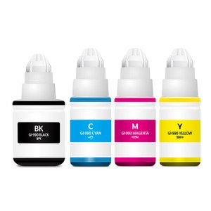 캐논 호환 잉크 GI-990 세트는 검정, 파랑, 빨강, 노랑 4색으로 구성되어 있어 다양한 문서와 사진 인쇄에 적합하며, 리필용으로 경제적이고 연속적인 출력이 가능하다.