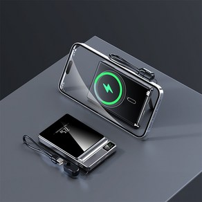 20000mAh 대용량과 급속 무선충전을 지원하며 Type-C와 애플용 자체 케이블이 내장되어 휴대성과 편리함을 갖춘 초슬림 보조배터리.