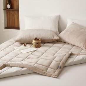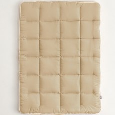 히팅솜 충전재와 극세사 원단을 사용해 포근한 촉감과 따뜻함을 제공하며 침대 위에 깔아 겨울철 보온성을 높여 사용할 수 있는 베이지 색상의 침대 패드였다.