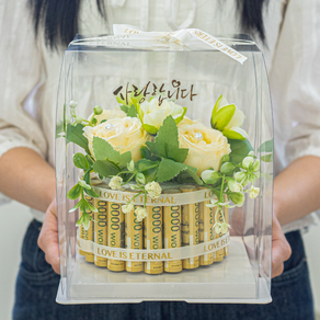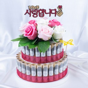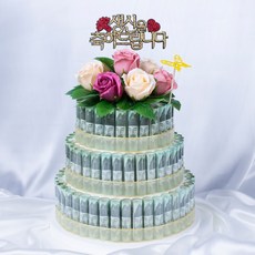 지폐 20장을 케이크 내부에 넣어 특별한 메시지와 함께 선물할 수 있으며 비누장미와 리본 세트, 원형 케이스가 포함되어 있어 완성도 높은 기념일 선물 연출이 가능한 구성이다