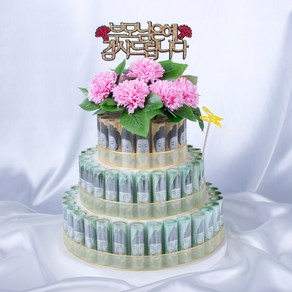 지폐 100장을 활용해 4단 구조로 구성된 돈케이크 제작 세트로 생일 축하 문구가 포함되어 있어 특별한 날 풍성하고 화려한 서프라이즈 선물을 연출할 수 있는 DIY 상품이다